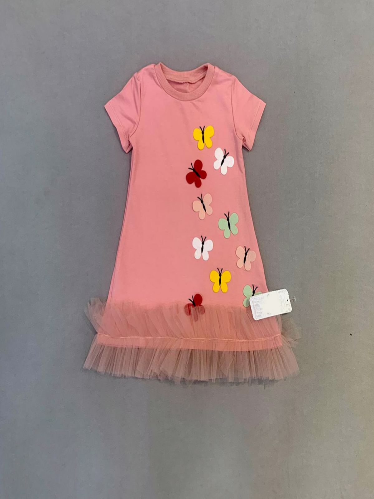 1-2-3 Yaş Renkli Kelebekler Nakışlı Eteği Fırfırlı Jile Çocuk Elbisesi