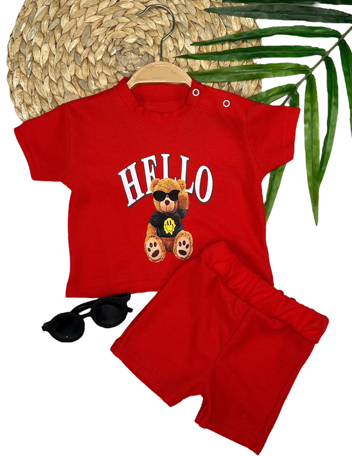 9-12-18-24 Ay Hello Gözlüklü Ayıcık Baskılı Şortlu Kısa Kollu Tişört 2li Erkek Bebek Takımı