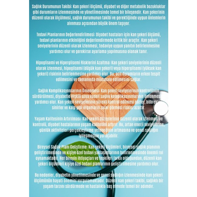 Hoş Geldiniz! Diyabet yönetimi, disiplin ve dikkat gerektiren önemli bir süreçtir. Diyabet kan şekeri takip çizelgesi defteri, sağlık durumunuzu günlük olarak izlemenize ve yönetmenize yardımcı olacak pratik bir araçtır. 2025 için özel tasarımımız, size her gününüzü organize etmek ve sağlık hedeflerinize ulaşmanızı sağlamak için gereken tüm araçları sunar. Özellikler: A Kalite Malzeme: Dayanıklı ve kaliteli bir malzeme seçerek defterinizi yıl boyunca güvenle kullanabilirsiniz. ; 12 Aylık Planlama: Her ay için ayrılmış sayfalar sayesinde kan şekerinizi her gün düzenli olarak izleyebilirsiniz. Bu düzenli takip, sağlık durumunuzdaki değişiklikleri daha iyi anlamanıza ve kontrol altında tutmanıza yardımcı olur. ; Özel Tasarım: Renkli ve kullanıcı dostu tasarımımız, defterinizi kullanmayı daha keyifli hale getirir. Gün içindeki öğünleri, egzersizleri ve ilaç alımını kolayca kaydedebilirsiniz. ; Hedef Belirleme Alanları: Her ayın başında hedeflerinizi belirleyebileceğiniz özel alanlar bulunur. Bu hedefler, sağlıklı yaşam tarzınıza odaklanmanıza ve ilerlemenizi izlemenize yardımcı olur. ; Not Alma Alanları: İhtiyaç duyduğunuzda önemli notlar alabileceğiniz geniş alanlar sunar. Doktor randevuları, ilaç değişiklikleri veya diğer önemli bilgileri buraya kaydedebilirsiniz. ; Bu defter, sizin için sadece bir takip aracı olmanın ötesinde, diyabet yönetiminizdeki önemli bir yardımcı olacaktır. Sağlığınızı izlemek ve iyileştirmek için adım atmaya hazır mısınız? 2024 için bu özel tasarım defteriyle, daha sağlıklı bir geleceğe adım atın! Kapaklar 320 gr İç Kağıtları 160 gr spiralli A4
