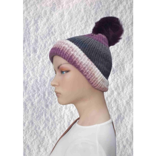 El Örgüsü Doğal Yün ve Akrilik Karışımlı Sıcacık Kış Beresi Mor Gri Karışık Renk