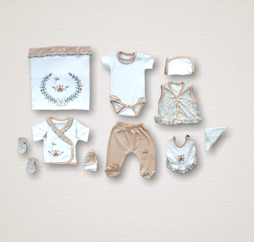 Erguvan Taç Nakışlı %100 Cotton Antibakteriyel Kız Bebek 10lu Zıbın Takımı Hastane Çıkışı
