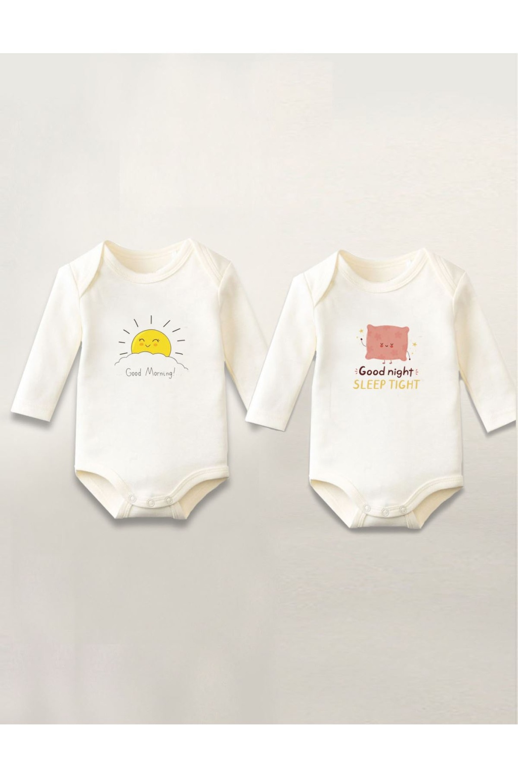 Good Night Morning Baskılı 2'li Pamuklu Uzun Kollu Çıtçıtlı Bebek Body Zıbın Atlet Tulum