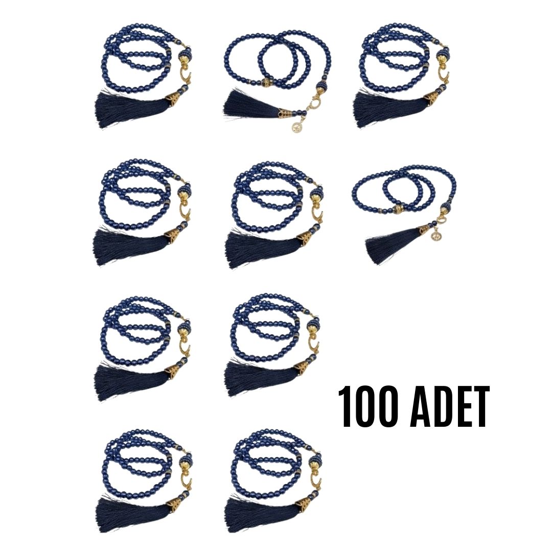 Namaz Tesbihi Vavlı 99'lu Cam İncili Esma'ul Hüsna Dua Kartı ile Lacivert Renk Hediyelik 100 Adet