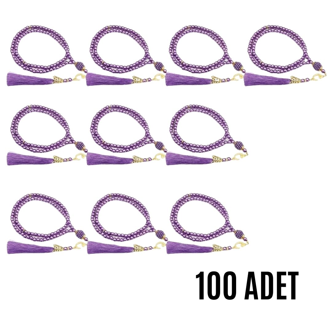 Namaz Tesbihi Vavlı 99'lu Cam İncili Esma'ul Hüsna Dua Kartı ile Mor Renk Hediyelik 100 Adet