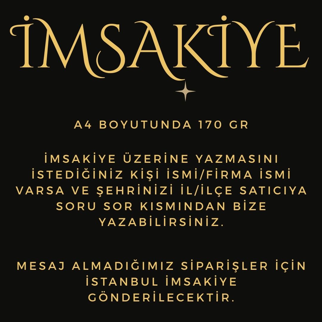 Ramazan ayının maneviyatını size özel bir dokunuşla taçlandırın! İster kendi aileniz için Örnek olarak "Kaya Ailesi" yazdırın, ister firmanızın reklamını yaparak müşterilerinize kalıcı bir hediye sunun. Yüksek Kalite: 300 gram kalın ve dayanıklı kağıda basılmaktadır (Kartpostal sertliğindedir). Tamamen Size Özel: Üzerine isim, soyisim, aile adı veya firma bilgilerinizi ekletebilirsiniz. Net Görünüm: A4 boyutunda (21x29.7 cm) okunaklı ve şık tasarım. ⚠️ ÖNEMLİ SİPARİŞ NOTU: İmsakiyenizin doğru hazırlanabilmesi için, siparişinizi oluşturduktan hemen sonra "Satıcıya Soru Sor" panelinden; Yazılacak İsim veya Firma Adını, İmsakiye vakitlerinin hangi Şehir ve İlçe için olacağını iletmeyi lütfen unutmayınız. Aksi Takdirde İstanbul İmsakiye Gönderilecektir.