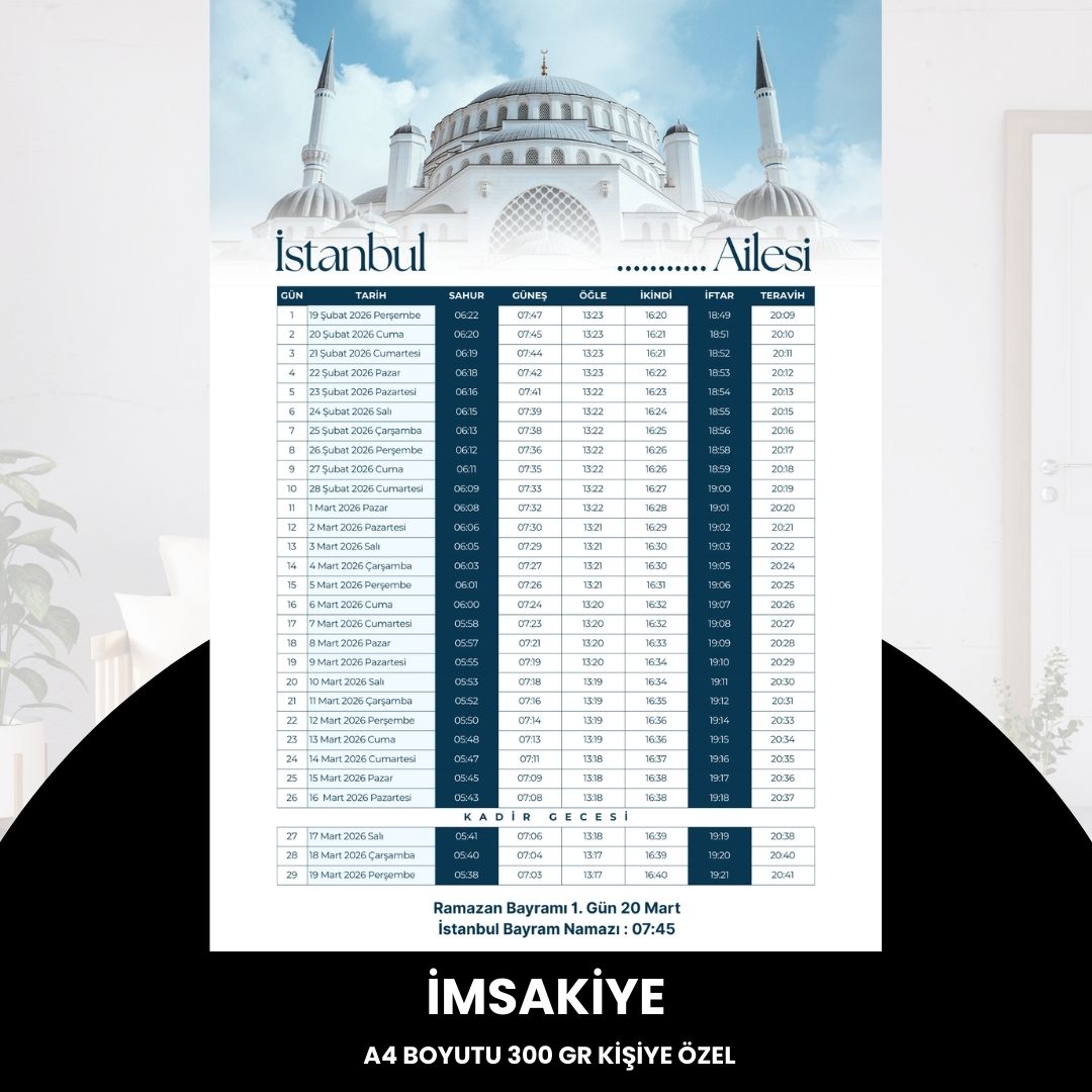 Ramazan ayının maneviyatını size özel bir dokunuşla taçlandırın! İster kendi aileniz için Örnek olarak "Kaya Ailesi" yazdırın, ister firmanızın reklamını yaparak müşterilerinize kalıcı bir hediye sunun. Yüksek Kalite: 300 gram kalın ve dayanıklı kağıda basılmaktadır (Kartpostal sertliğindedir). Tamamen Size Özel: Üzerine isim, soyisim, aile adı veya firma bilgilerinizi ekletebilirsiniz. Net Görünüm: A4 boyutunda (21x29.7 cm) okunaklı ve şık tasarım. ⚠️ ÖNEMLİ SİPARİŞ NOTU: İmsakiyenizin doğru hazırlanabilmesi için, siparişinizi oluşturduktan hemen sonra "Satıcıya Soru Sor" panelinden; Yazılacak İsim veya Firma Adını, İmsakiye vakitlerinin hangi Şehir ve İlçe için olacağını iletmeyi lütfen unutmayınız. Aksi Takdirde İstanbul İmsakiye Gönderilecektir.
