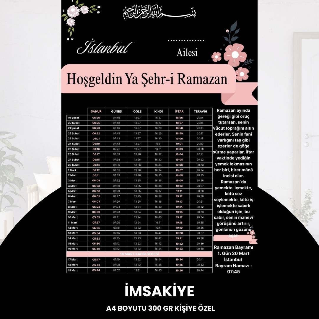 Ramazan ayının maneviyatını size özel bir dokunuşla taçlandırın! İster kendi aileniz için Örnek olarak "Kaya Ailesi" yazdırın, ister firmanızın reklamını yaparak müşterilerinize kalıcı bir hediye sunun. Yüksek Kalite: 300 gram kalın ve dayanıklı kağıda basılmaktadır (Kartpostal sertliğindedir). Tamamen Size Özel: Üzerine isim, soyisim, aile adı veya firma bilgilerinizi ekletebilirsiniz. Net Görünüm: A4 boyutunda (21x29.7 cm) okunaklı ve şık tasarım. ⚠️ ÖNEMLİ SİPARİŞ NOTU: İmsakiyenizin doğru hazırlanabilmesi için, siparişinizi oluşturduktan hemen sonra "Satıcıya Soru Sor" panelinden; Yazılacak İsim veya Firma Adını, İmsakiye vakitlerinin hangi Şehir ve İlçe için olacağını iletmeyi lütfen unutmayınız. Aksi Takdirde İstanbul İmsakiye Gönderilecektir.