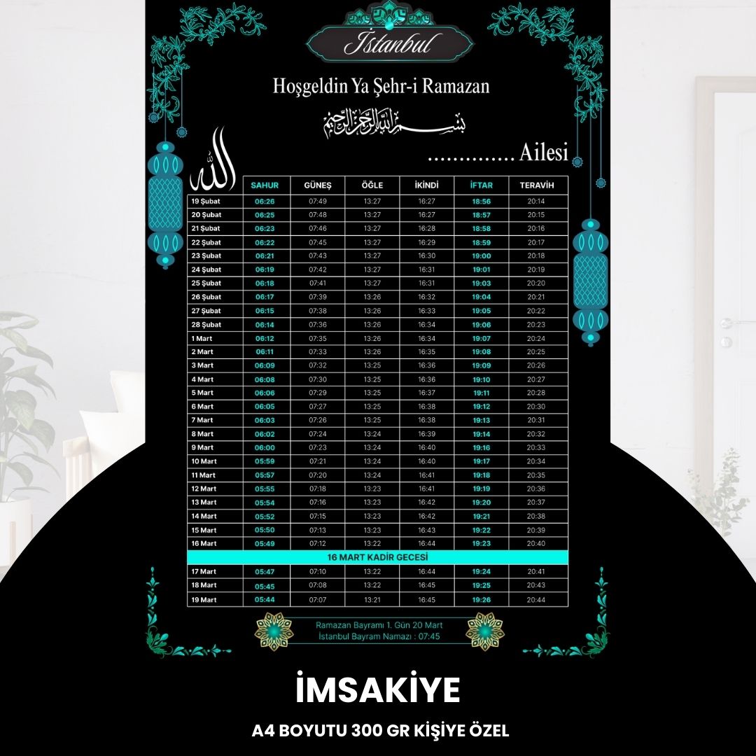 Ramazan ayının maneviyatını size özel bir dokunuşla taçlandırın! İster kendi aileniz için Örnek olarak "Kaya Ailesi" yazdırın, ister firmanızın reklamını yaparak müşterilerinize kalıcı bir hediye sunun. Yüksek Kalite: 300 gram kalın ve dayanıklı kağıda basılmaktadır (Kartpostal sertliğindedir). Tamamen Size Özel: Üzerine isim, soyisim, aile adı veya firma bilgilerinizi ekletebilirsiniz. Net Görünüm: A4 boyutunda (21x29.7 cm) okunaklı ve şık tasarım. ⚠️ ÖNEMLİ SİPARİŞ NOTU: İmsakiyenizin doğru hazırlanabilmesi için, siparişinizi oluşturduktan hemen sonra "Satıcıya Soru Sor" panelinden; Yazılacak İsim veya Firma Adını, İmsakiye vakitlerinin hangi Şehir ve İlçe için olacağını iletmeyi lütfen unutmayınız. Aksi Takdirde İstanbul İmsakiye Gönderilecektir.