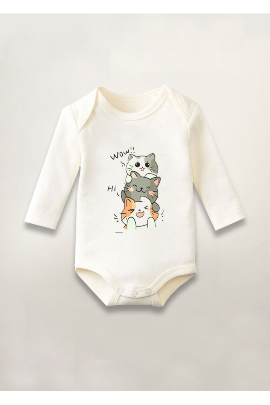 Sevimli 3 Kedi Cat Baskılı Pamuklu Uzun Kollu Çıtçıtlı Bebek Body Zıbın Atlet Tulum